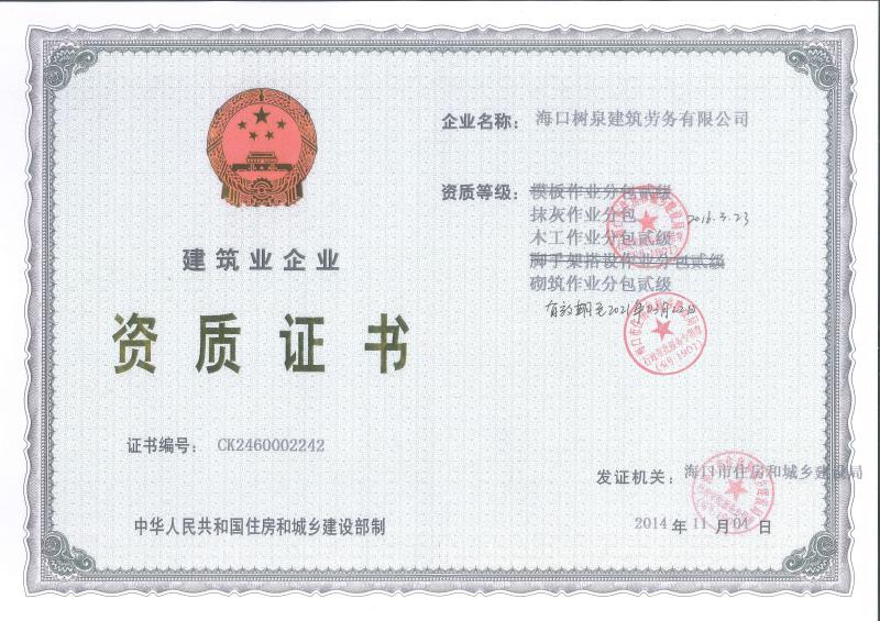 海口樹泉建筑勞務有限公司成立于2011年,公司位于???,其前身是一家專業建筑施工隊,自2004年即開始在海南從事建筑勞務施工。自成立至今,公司已經擁有一支科學管理、質量過硬、能打硬仗,搶工期的專業隊伍。能獨立承擔大中型工業與民用建筑 、室內外裝修、各類機電設備安裝工程。代表工程有??跒I海華庭、三亞時代海岸T01/02/04/05棟高層、合肥東?;▓@二期、陵水富力灣B區高層、三亞金中海(酒店)、瓊海大印經典花園、??诃h球海景大酒店(四星級酒店,在建中)、陵水珍珠大廈(五星酒店)、??谌f達廣場、美蘭機場二期。